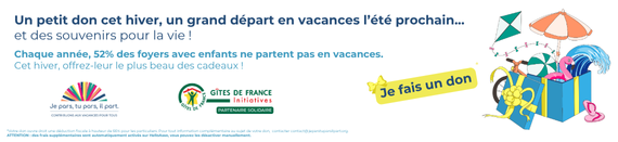 À l’occasion des fêtes de fin d’année, la Fondation Je pars, tu pars, lance sa première campagne de collecte de dons pour offrir aux familles en difficulté le plus beau des cadeaux : un ou plusieurs jours de vacances l’été prochain… et des souvenirs pour la vie ! Gîtes de France® Initiatives s’associe à cette collecte !