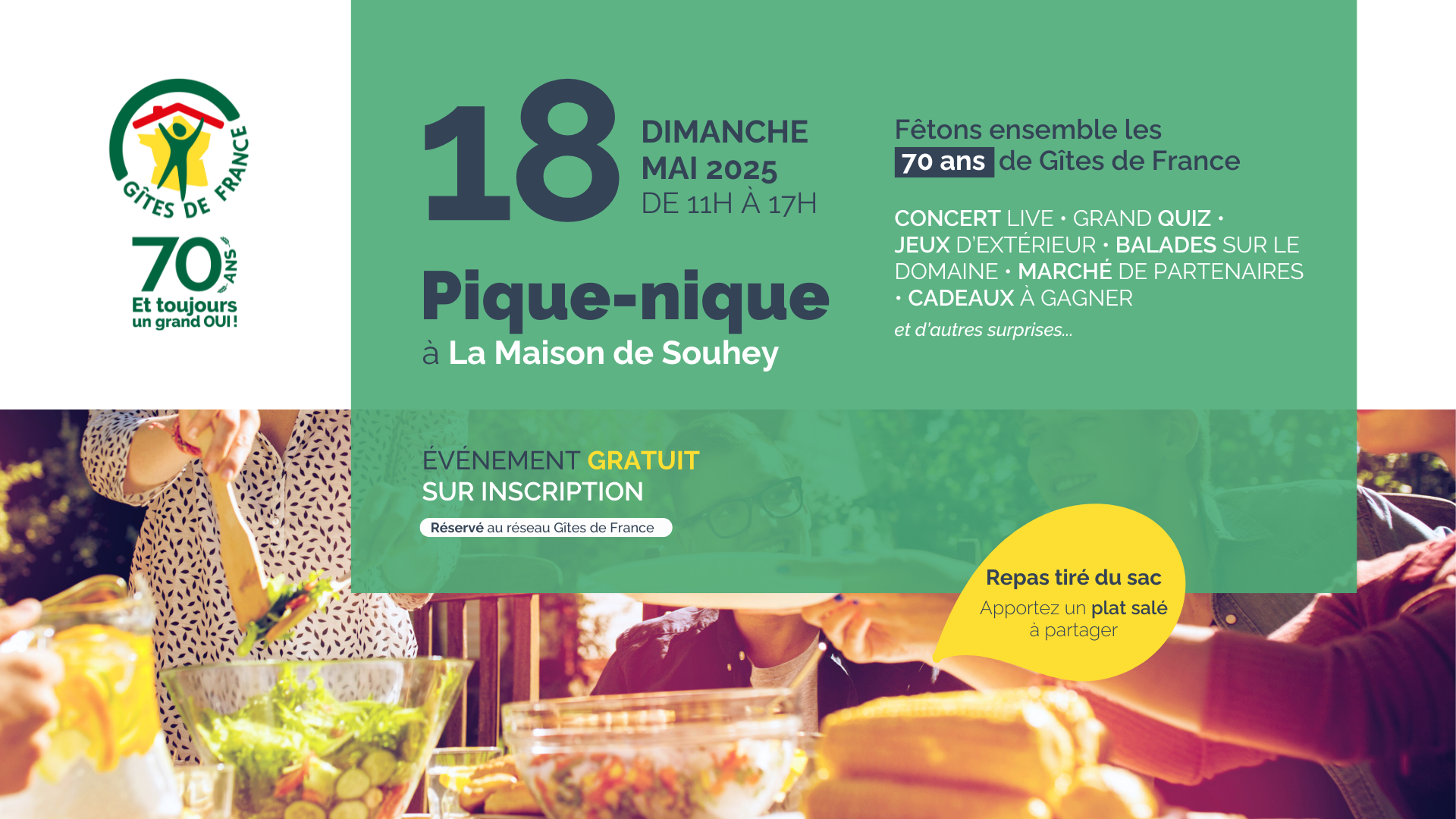 L’association Gîtes de France® Côte-d’Or – Nièvre est heureuse de vous inviter à son pique-nique géant des 70 ans.